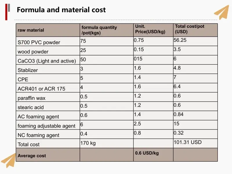 Bahan mentah untuk membuat panel pintu dan bingkai pintu WPC termasuk: resin PVC, serbuk kayu, CaCo3 dan bahan tambahan Kimia, pengilang boleh menyesuaikan formulasi mengikut keperluan produk pasaran.